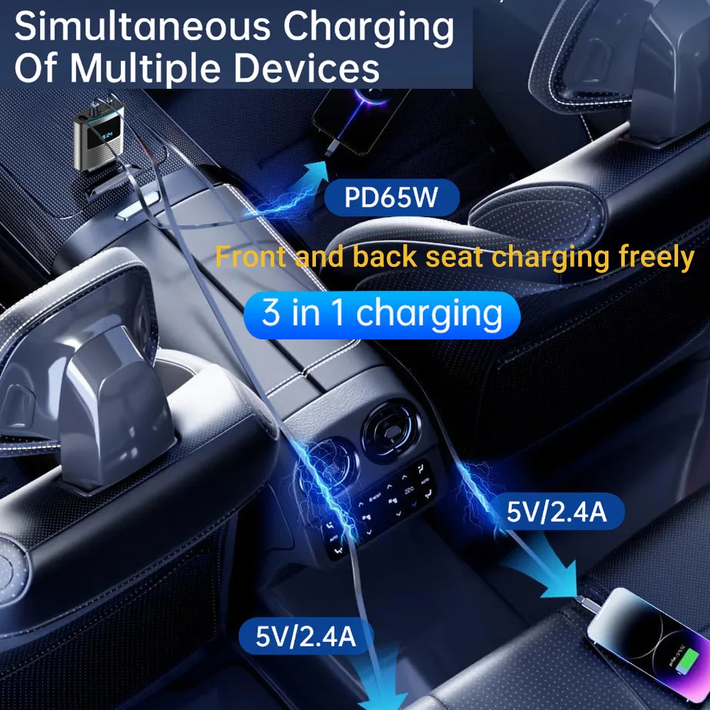 This 65W/80.5W 3-in-1 Retractable Car Charger, engineered for high-speed, multi-device charging. Featuring PD65W + QC3.0 + 5-protocol fast charging, this powerhouse fuels phones, tablets, and laptops simultaneously. The smart retractable cable system (expandable up to 3 devices) with 180° adjustable heads and real-time voltage monitoring ensures safe, clutter-free charging for every seat.