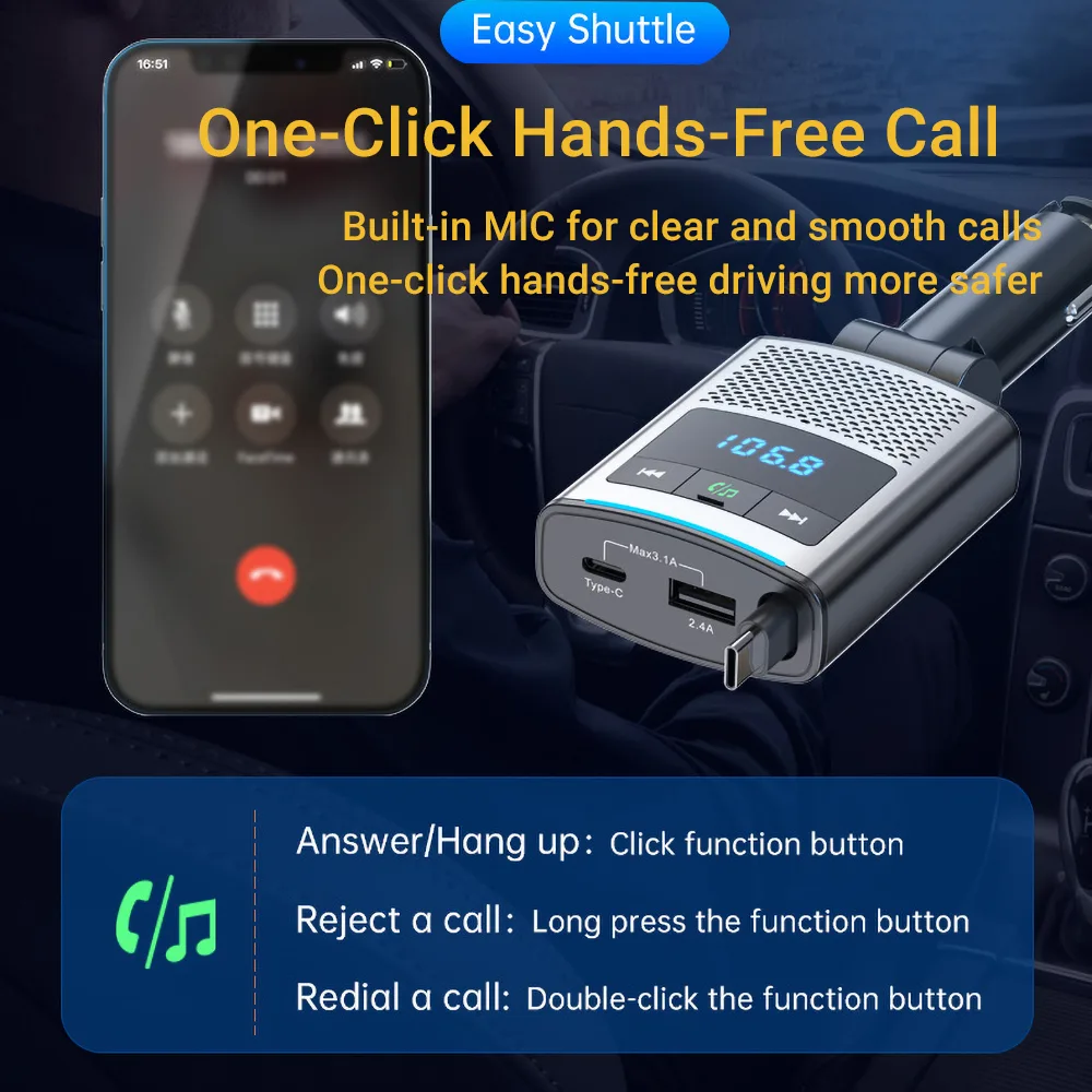 - Bluetooth 5.3 + FM Transmitter – Lossless music, hands-free calls & navigation voice broadcast.