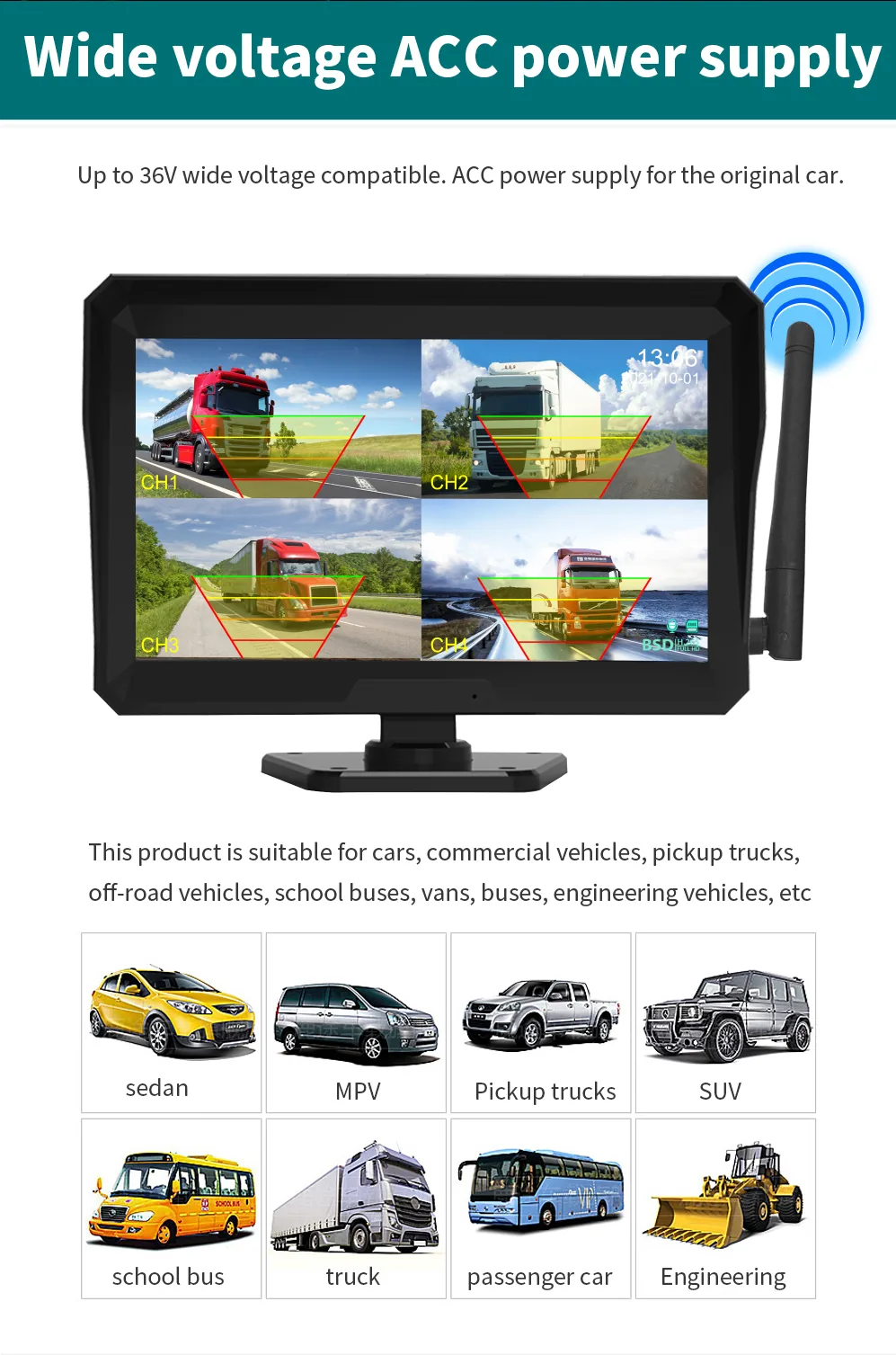 This product is suitable for cars, commercial vehicles, pick up trucks, off-road vehicles, school buses, van, buses, engineering vehicles, etc.