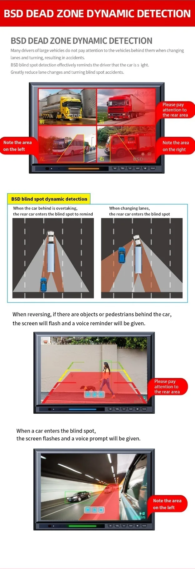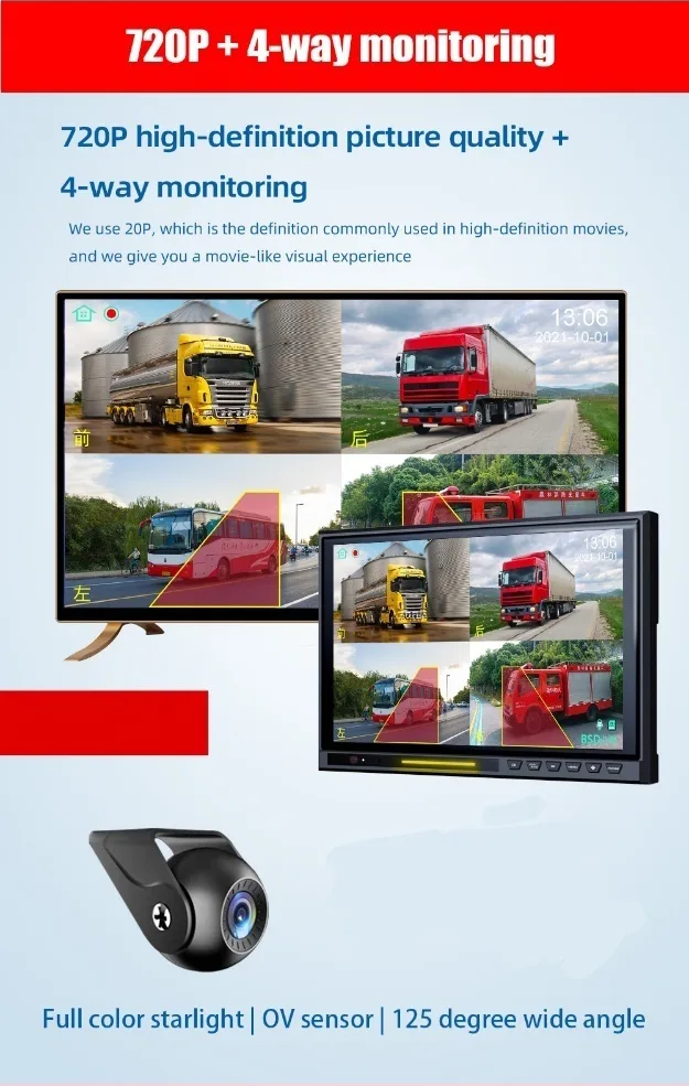 This BSD truck monitor is suitable for cars, commercial vehicles, pick up trucks, off-road vehicles, school buses, van, buses, engineering vehicles, etc. 720P + 5-way monitoring