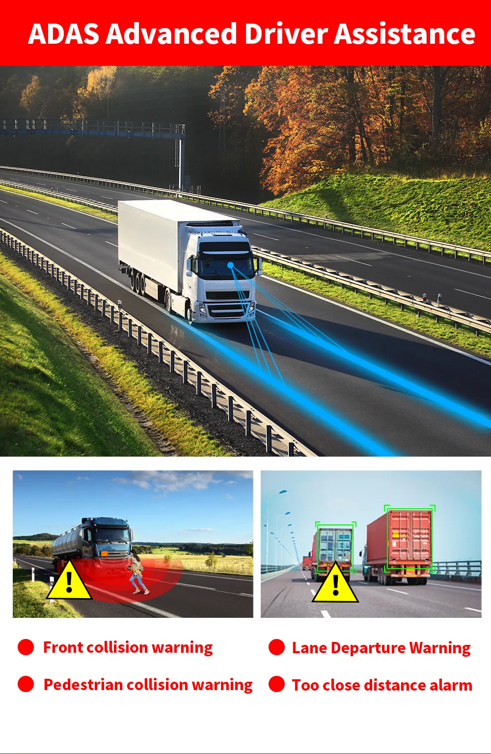 - ADAS (Advanced Driver Assistance) – Lane departure, forward collision, and pedestrian detection warnings