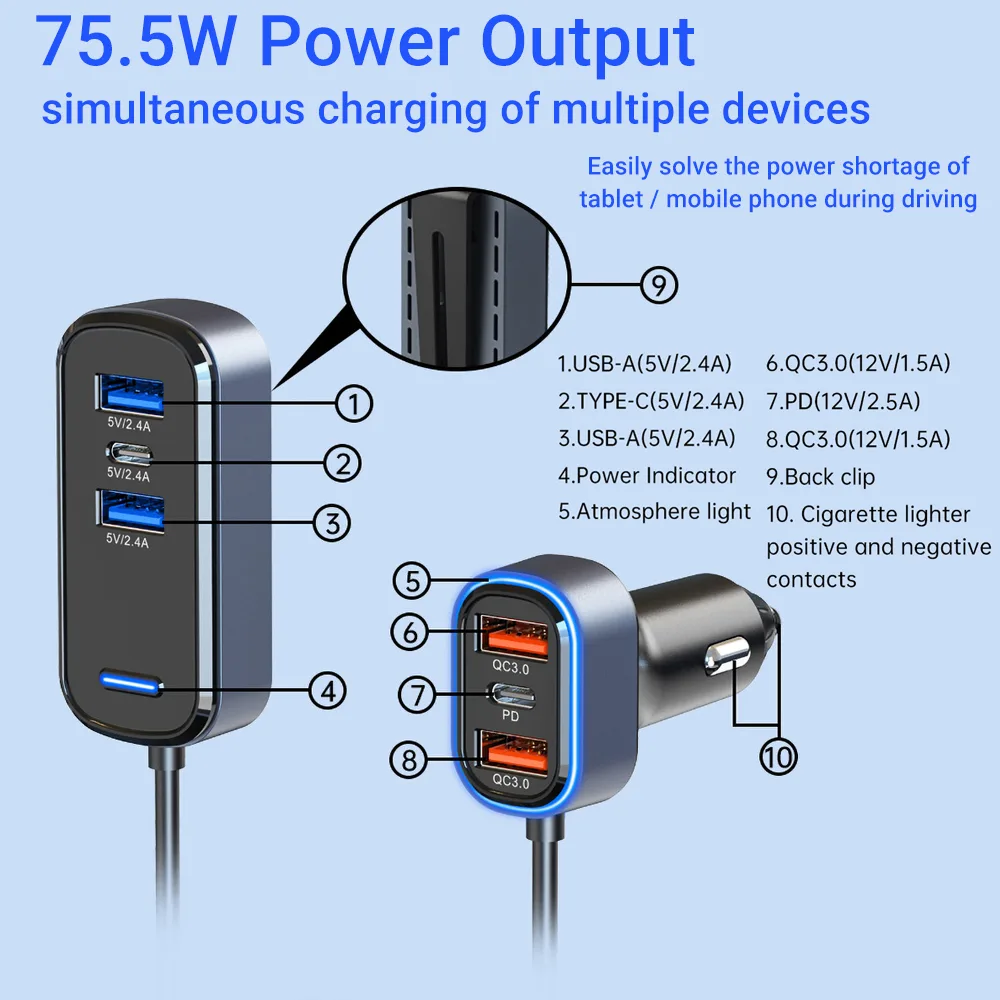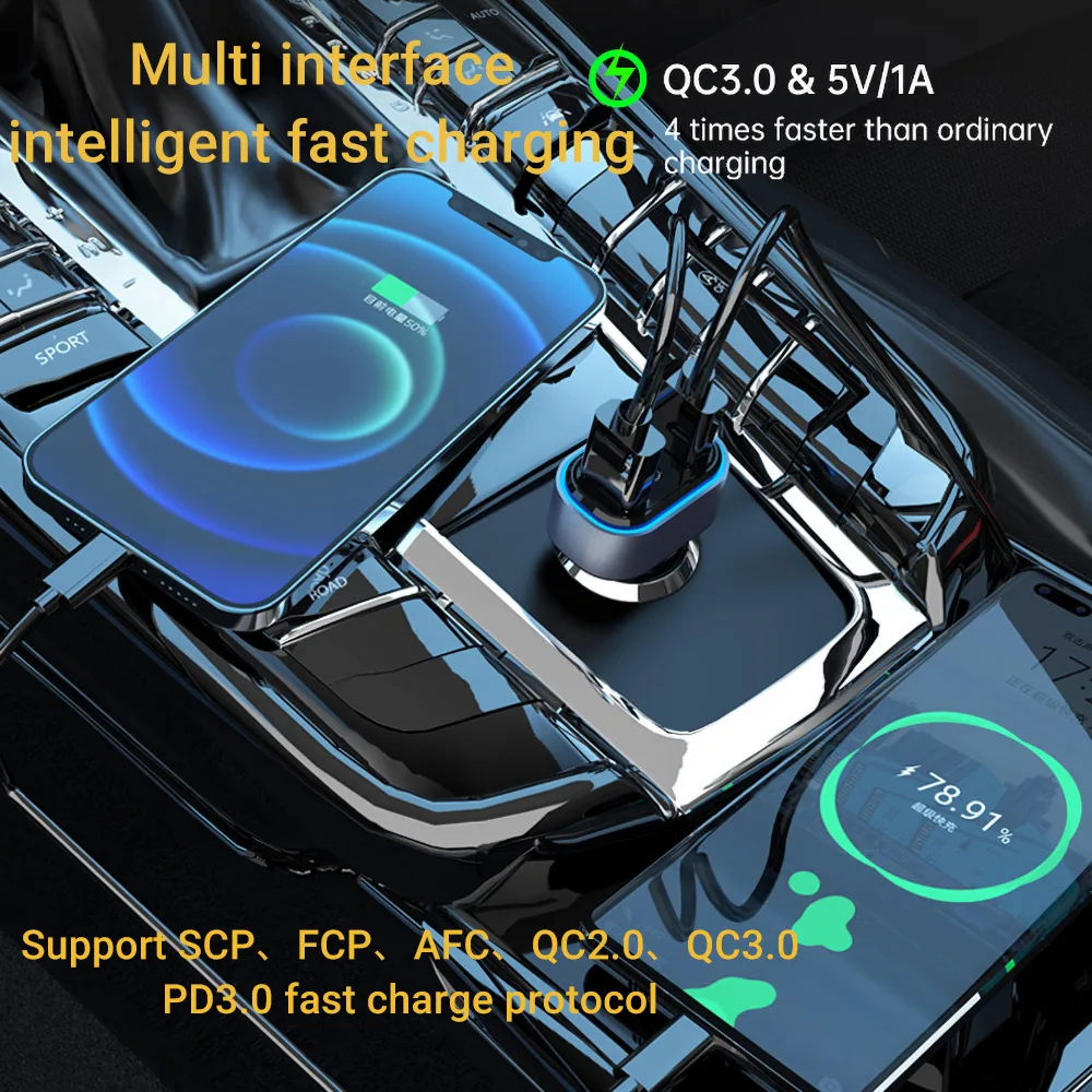 Car Charger Expansion 6 In 1 Multi port output/PD3.0 fast charging