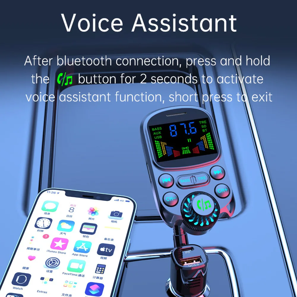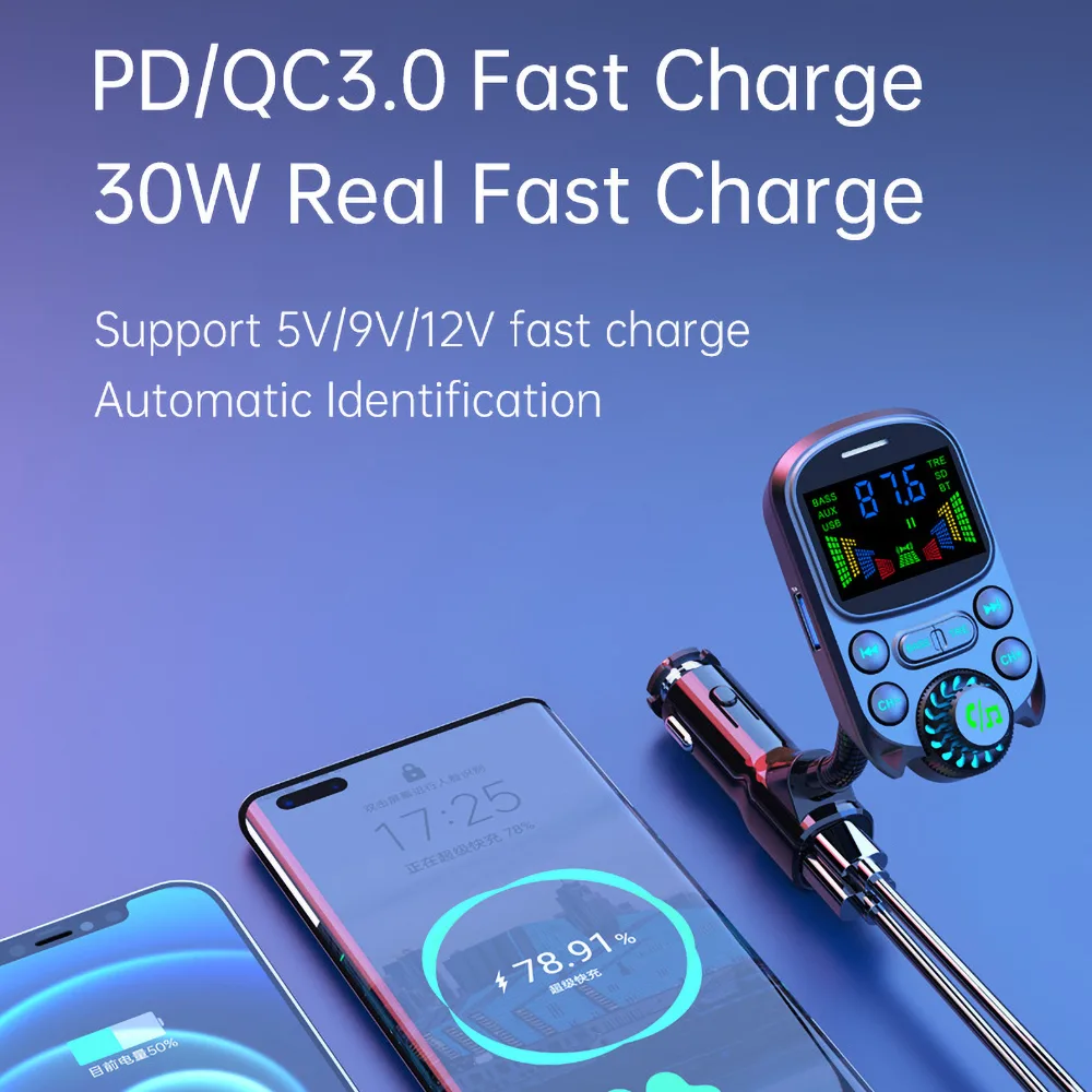 Upgrade your drive with this all-in-one Bluetooth FM transmitter. Enjoy seamless music streaming, hands-free calls, and rapid device charging with QC3.0 and PD 30W ports. Features include bass boost, 3.5mm AUX input, and support for multiple audio formats.