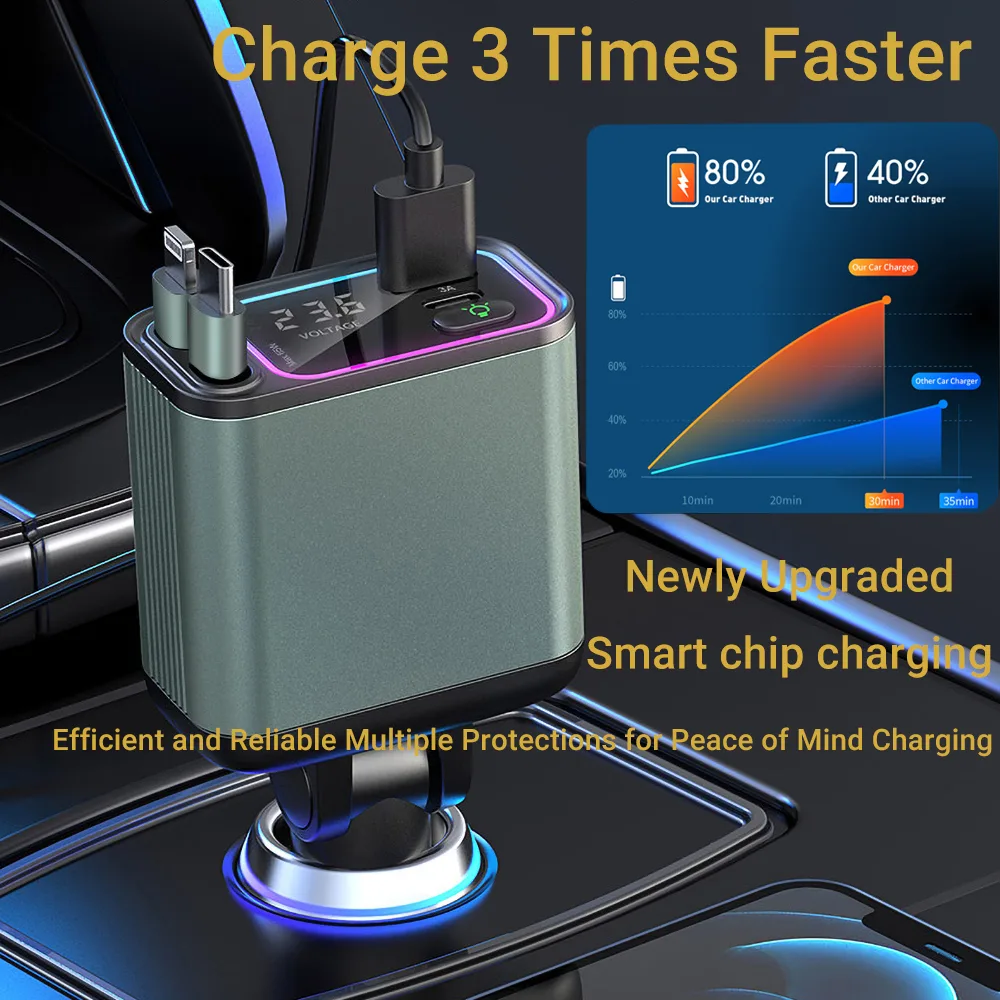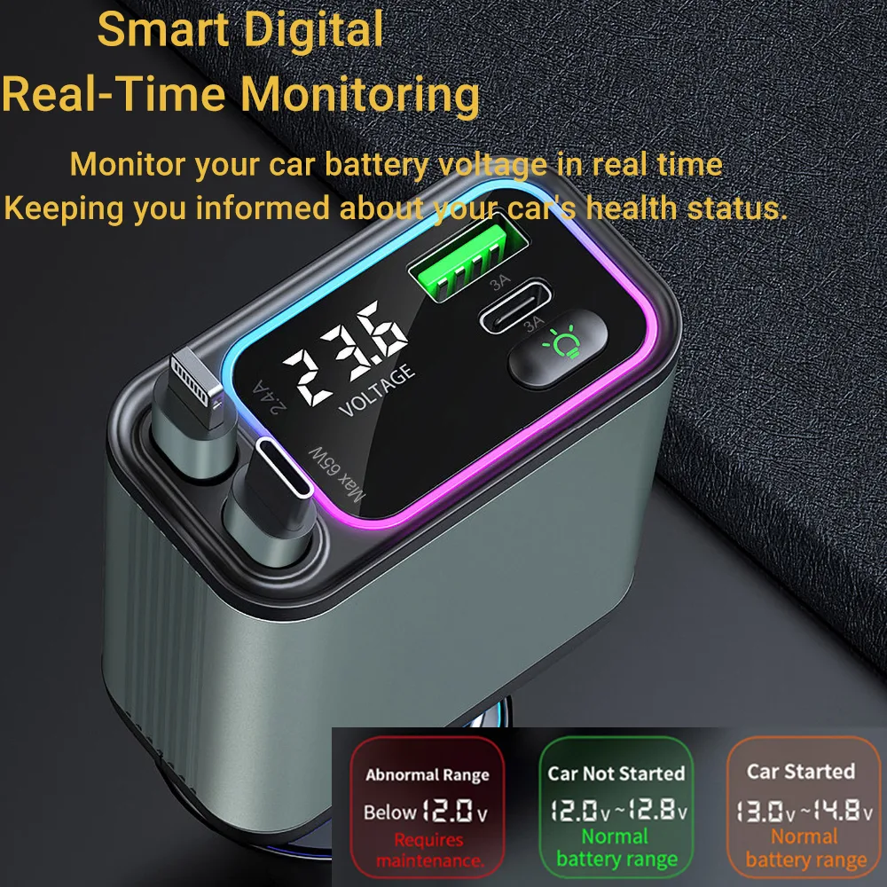 This 4-in-1 retractable car charger, featuring PD65W ultra-fast charging, an 80cm stretchable cable, and multicolor ambient lighting. Intelligently charges phones, tablets, and laptops simultaneously while monitoring your car’s battery health. The aerospace-grade aluminum alloy body ensures durability, and 6-layer safety protection keeps devices secure.