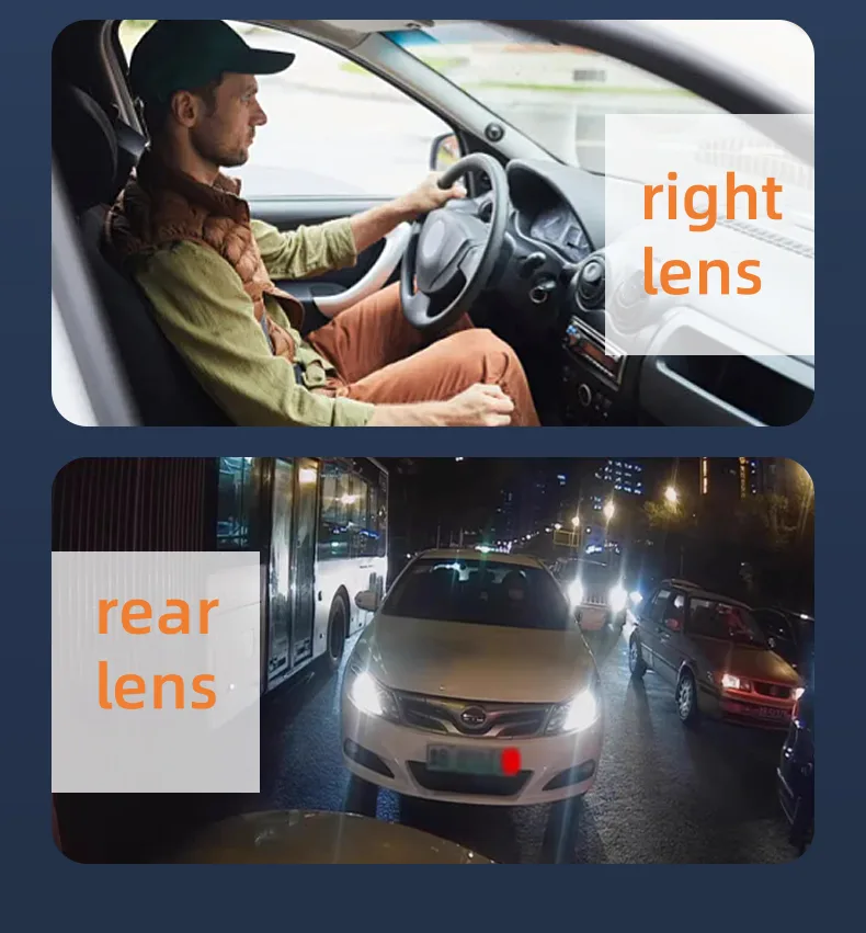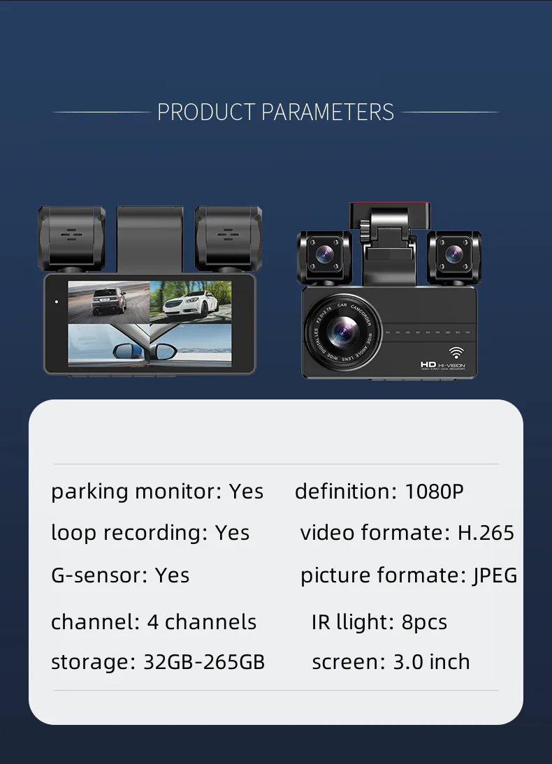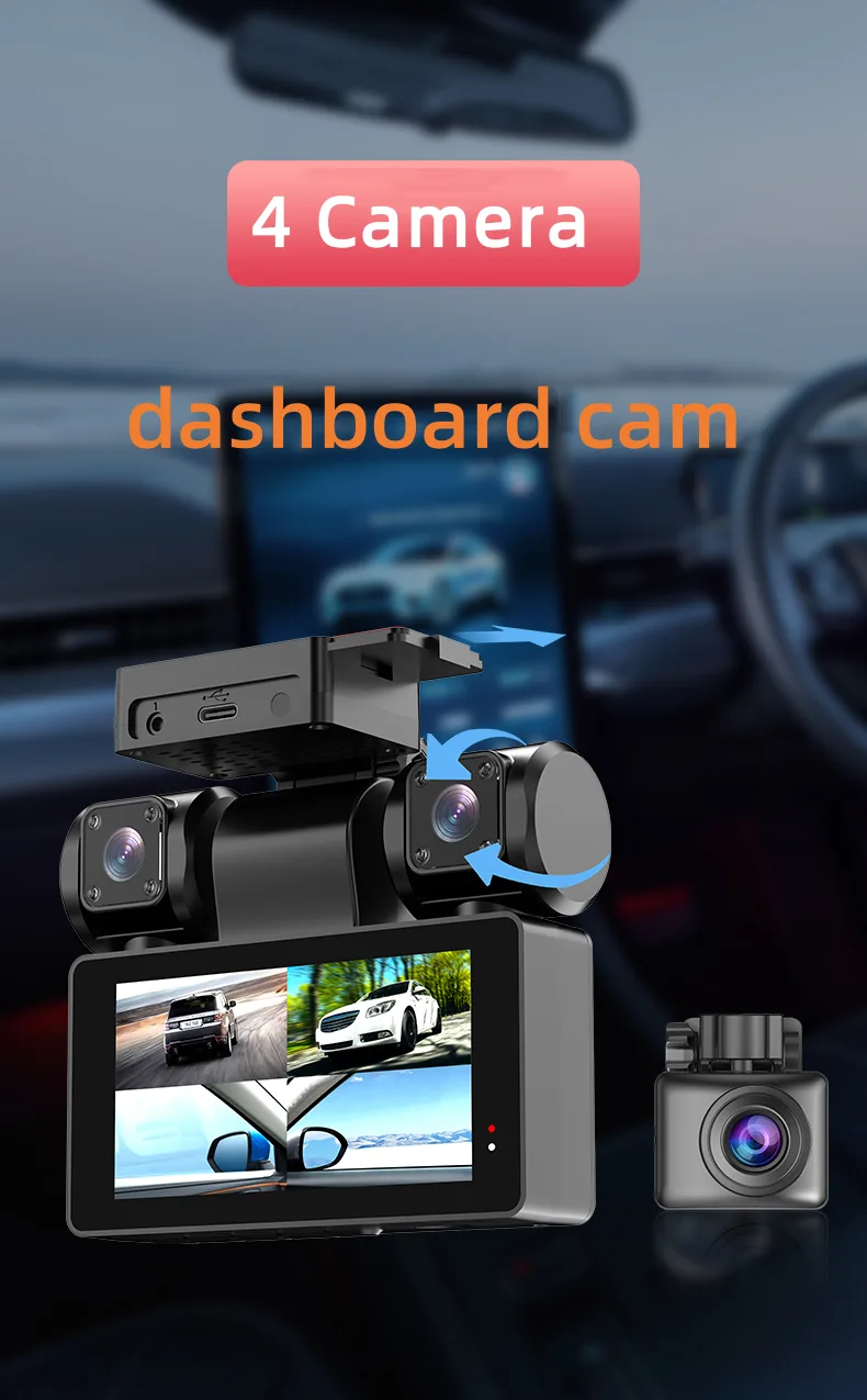 The C110 dash cam is a DVR with support 4 channels recording. Can record car front, car right and left and the car out side. Touch screen is make operation easier and clear. It support all a car dvr function, camera support with WDR, auto recording, voice recording, night vision, loop recording, motion detection, G-sensor, parking monitor, playback function. It also with multiple language. The rear view lens with reversing function.